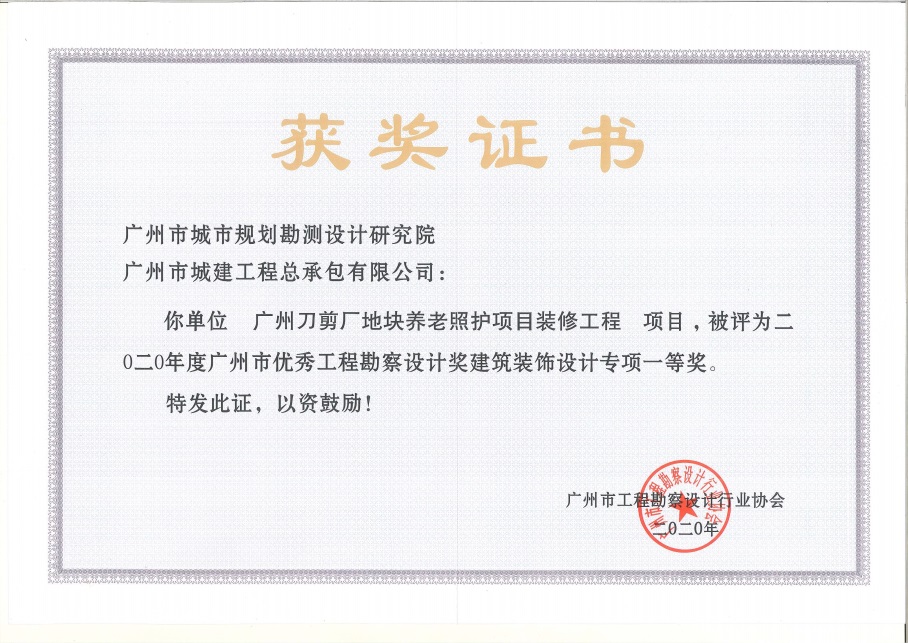 公司廣州刀剪廠地塊養(yǎng)老照護(hù)項目裝修分部分項工程在廣州市2020年度優(yōu)秀工程勘察設(shè)計獎評選中獲建筑裝飾設(shè)計專項一等獎。主要設(shè)計人員包括:江永耀、袁學(xué)松、錢萍、陳麗牡、陳建拓、崔衛(wèi)琪、盧穎欣、朱鳳樁。